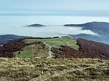 Plus bas les derniers kilomètres de la montée du col du Grand Ballon côté sud et mer de nuages.
