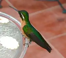 Cet oiseau mesure environ 10,5 cm. Il ressemble beaucoup au Colibri à gorge pourprée mais le mâle a la gorge blanche et la femelle la queue plus terne.