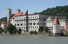 C'est en 1611 que le prince-évêque de Passau, Léopold d'Autriche, appelle les jésuites. Ceux-ci commandent à leur confrère Johannes Isfording (architecte jésuite originaire de Molsheim en Alsace) la construction en 1613 d'un vaste bâtiment rectangulaire. À l'ouest du bâtiment se trouve l'église jésuite Saint-Michel qui domine l'ensemble de ses tours jumelles.