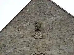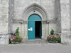 Au centre de la façade occidentale s'ouvre un portail à quatre voussures reposant sur des colonnes engagées, les trois voussures extérieures sont en arc brisé et sont intercalées de décors en dents de scie et roses. Les corbeilles des chapiteaux sont décorées de personnages de style roman. On peut retrouver les mêmes types de personnage sur le portail de l'église de la Trinité-Porhoet[8]. Le portail occidental est surmonté d'une fenêtre à deux lancettes. À l'intérieur du remplage, deux arcatures supportent un cercle. Au-dessus de la fenêtre à deux lancettes, le gable du pignon est orné d'un "écu de Bretagne couché à l'antique et timbré d'un heaume" (Pol de Courcy, "De Rennes à Brest"[5]).