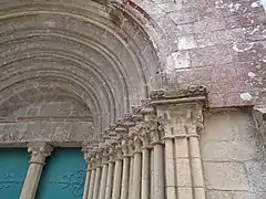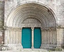 Entre ces chapelles s'insère un portail du XIIe siècle, typiquement roman. Il comporte six voussures en plein cintre sans décoration. Les voussures reposent sur douze colonnettes jumelées à chapiteaux décorés de roses et de feuillages. Les deux chapiteaux les plus externes sont ornés de figurines supportant sur leur dos ou sur leur tête les voussures. La colonne centrale est du XIVe siècle.
