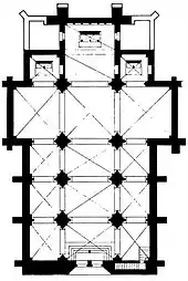 L'abside est carrée, fermée par un mur droit à trois étages. En bas, celui-ci est orné d'une galerie d'arcades romanes fermées qui prend appui sur un banc de pierre, avec une piscine liturgique.