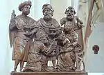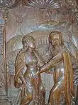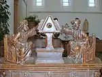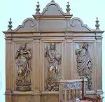 ![]() Cette œuvre du XVIe siècle, située dans le chœur, représente le Christ entouré de la Vierge et de saint Pierre. Jésus tient dans sa main le globe terrestre surmonté d'une croix. Marie porte l'enfant Jésus. |