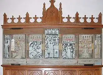 ![]() Cette croix du XIVe siècle a été retrouvée en 1943, enterrée dans le cimetière. Elle a été placée dans le transept sud (à droite quand on regarde le chœur). Elle montre le Christ crucifié, surmonté par deux anges qui portent le soleil et la lune. Sur l'autre côté, on voit la Vierge, couronnée par un ange. La croix est décorée de nombreuses fleurs et d'évocations de pierreries. |