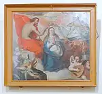 ![]() Il s'agit d'un tableau peint au XVIe siècle par un artiste d'origine hollandaise. Il représente la Vierge, assise dans les cieux et entourée par la Trinité : le Père et le Fils qui la couronnent, l'Esprit Saint sous la forme d'une colombe. |