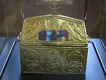 - Le chrismale ou coffret de Mortain, du VIIe siècle, consiste en une boite en forme de maison en bois de hêtre évidée, revêtue de lamelles de cuivre repoussé et doré, avec un couvercle à deux pans. Cet objet, anglo-saxon comportant une inscription en runes, est destiné à porter l'Eucharistie en voyage. Sur le toit est représenté un ange aux ailes déployées, mutilé par une fenêtre lorsque le chrismale est devenu reliquaire entre 1864 et 1899. Deux oiseaux se trouvent à côté de cet ange. À l'avant est représenté le Christ pantocrator entre saint Michel et saint Gabriel. Le faîtage du toit est décoré à ses extrémités par deux acrotères en forme de lyre. Une inscription en caractères runiques : QUE DIEU AIDE EADA QUI FIT CE KIISNEEL. Les runes localisent cet objet du nord de l'Angleterre où le chrismale était porté par des moines irlandais[23].