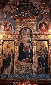 - Autel des Alberti : panneau de la Nativité[4], avec saint Joseph et Marie adorant l'Enfant. Au-dessus un ange annonce la naissance aux bergers. En bas, à gauche, le donateur en costume de style Louis XII. La prédelle a disparu. Deux panneaux placés au-dessus, de part et d'autre d'une sculpture représentant une Vierge à L'Enfant, représentent la scène de l'Annonciation avec un ange à gauche et la Vierge, à droite. Les peintures sont attribuées à Louis Bréa. Elles ont été placées dans un retable daté de 1710. Le donateur permet de dater l'œuvre autour de 1510.