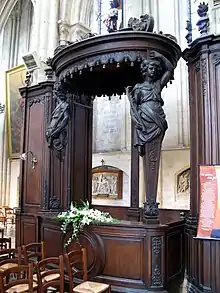 Cet ouvrage de menuiserie date de 1731[9]. Réalisé par Adrien Le Jeune d'Abbeville, il représente un dais ovale soutenu par deux cariatides et orné de lambrequins dont les oves comportaient jadis des fleurs de lys sculptées. Ce meuble est surmonté de la statue de la religion sous laquelle pointent des canons évoquant l'un des donateurs, Louis Auguste de Bourbon, grand maître de l'Artillerie, duc du Maine et comte d'Eu de 1693 à 1736, qui avait offert le bois nécessaire à sa confection [10].