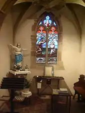 Le chœur de l'église est orné de huit vitraux. Ces vitraux représentent, au centre, les apôtres saint Pierre et saint Paul, entourés par les quatre évangélistes Luc et Matthieu à gauche, Marc et Jean. Enfin de chaque côté un vitrail, qui n'est pas visible depuis le reste de l'église, symbolise à l'extrémité gauche la Vierge Marie, à l'extrémité droite l'Eucharistie.