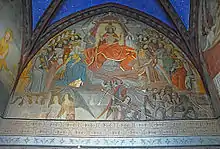 À l'étage du massif occidental, le mur cloison qui sépare aujourd'hui la tribune de la nef porte un décor s'organisant autour d'une crucifixion inscrite dans un médaillon. À droite et à gauche deux séraphins sont montés sur des roues, probable allusion à la vision d’Ézéchiel (I, 4-27). Dans l'écoinçon gauche un personnage agenouillé est sans doute l'un des donateurs de la peinture. L'arc qui surmonte l'ensemble montre une superposition de décors peints : rinceaux, faux appareil, enfin anges contemporains de la scène centrale.