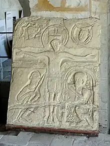 Dans la tribune, on aperçoit des fragments de la décoration de la première façade de l'an 1000, sur lequel est venu s'appuyer le massif occidental vers 1050. Ce décor se compose notamment d'un réseau de joints rouge formant des motifs décoratifs (losanges, appareil en arête-de-poisson) et d'une crucifixion qui témoigne des débuts de la sculpture dans l'art roman : la pierre est taillée en cuvette, les détails sont indiqués par de simples ciselures.