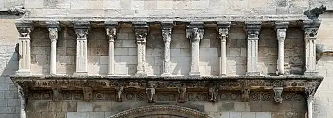 La fausse galerie est supportée par des modillons typiquement romans, ornés d'aigles et de têtes d'ânes et de béliers. À ses extrémités, elle est soutenue par deux élégantes colonnettes supportées par des têtes de bovidés.
