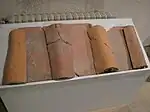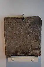 | Moitié droite dont le petit côté est orné d'une plante émergeant d'un vase. | n.c. | Époque gallo-romaine | Pierre | n.c. | Dépôt de la Salsa en 1963, provenance : Corre | Salle Barbey | [1] | |