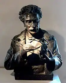 Buste de Jean-Léon Gérôme polychromant une Tanagra | Léopold Bernstamm | 1897 | Bronze patiné brun, fonte Siot-Decauville | h. 76 cm | Dépôt de l’État en 1949 | Salle Gérôme | [1],[12] |