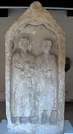 Couple tenant un gobelet et une bourse | n.c. | Époque gallo-romaine | Sculptée en bas-relief | n.c. | Dépôt de la Salsa en 1963, provenance : Corre | Salle Barbey | [1] |