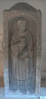 | Le défunt tient un volumen dans sa main droite. | n.c. | Époque gallo-romaine | Pierre | n.c. | Dépôt de la Salsa en 1963, provenance : Corre | Salle Barbey | [1] | |