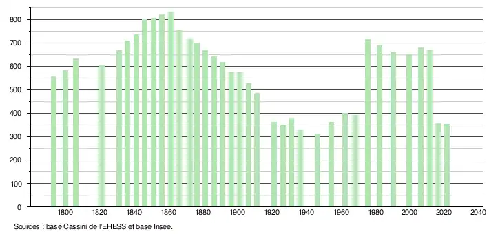 L'évolution du nombre d'habitants est connue à travers les recensements de la population effectués dans la commune entre 1793 et 2016 et dans la commune déléguée depuis 2017. À partir de 2006, les populations légales des communes sont publiées annuellement par l'Insee. Le recensement repose désormais sur une collecte d'information annuelle, concernant successivement tous les territoires communaux au cours d'une période de cinq ans. Pour les communes de moins de 10 000 habitants, une enquête de recensement portant sur toute la population est réalisée tous les cinq ans, les populations légales des années intermédiaires étant quant à elles estimées par interpolation ou extrapolation[16]. Pour la commune déléguée, le premier recensement exhaustif, entrant dans le cadre du nouveau dispositif a été réalisé en 2006[17].