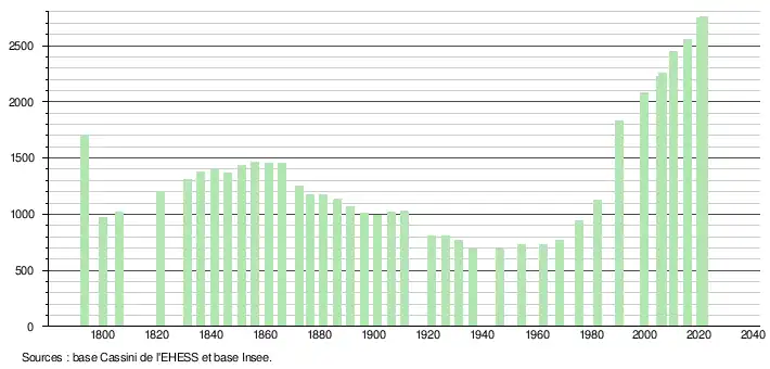 L'évolution du nombre d'habitants est connue à travers les recensements de la population effectués dans la commune depuis 1793. Pour les communes de moins de 10 000 habitants, une enquête de recensement portant sur toute la population est réalisée tous les cinq ans, les populations légales des années intermédiaires étant quant à elles estimées par interpolation ou extrapolation[14]. Pour la commune, le premier recensement exhaustif entrant dans le cadre du nouveau dispositif a été réalisé en 2005[15].