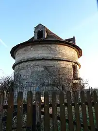 Colombier seigneurial de plan circulaire présentant un appareillage en pierre de taille. Le toit conique, protégé par de la tuile plate, est percé de deux lucarnes affichant chacune un arc en accolade. Intérieurement, les boulins sont conservés, mais la présence d'un plafond ajouté postérieurement indique que la partie supérieure du colombier était destinée au stockage de denrées[1].