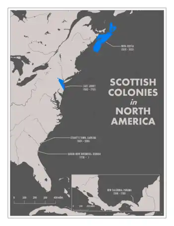 Bien que l'on présume que Henry Sinclair, premier comte des Orcades, un noble écossais, ait exploré l'Amérique du Nord au XVe siècle, le premier établissement écossais documenté se trouve en Nouvelle-Écosse en 1621. Le , la charte pour la fondation d'une colonie est donnée par Jacques VI d'Écosse à Sir William Alexander et, en 1622, les premiers colons y partent. Cet établissement échoue et une colonie permanente ne s'établit qu'en 1629. Légalement, la charte de la colonie établit que la Nouvelle-Écosse (définie comme toutes les terres entre la Terre-Neuve et la Nouvelle-Angleterre), faisait partie de l'Écosse. Plus tard, ce fait est utilisé pour contourner les Actes de navigation anglais.