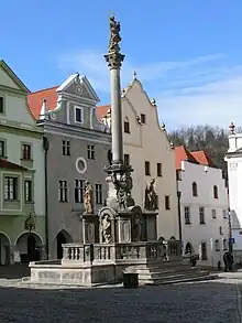 Cette colonne de la peste est dédiée à Notre-Dame, érigée en Vierge de l'Apocalypse à l'enfant sur une haute colonne corinthienne. Des saints importants du royaume de Bohême sont représentés sur la base. La fontaine entourant la colonne a été mentionnée pour la première fois dans les règlements de protection contre les incendies et de police publiés par Johann I. von Rosenberg en avril 1388.
