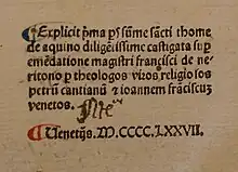 « Explicit prima pars Summae sancti Thome de Aquino, diligentissime castigata, super emendatione magistri Francisci de Neritono per theologos viros religiosos Petrum Cantianum et Joannem Franciscus Venetos. Venetiis MCCCCLXXVII. »
