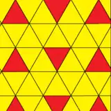 Par exemple, la coloration archimédienne d'un pavage triangulaire utilise deux couleurs (à gauche). Elle nécessite 4 couleurs pour devenir une coloration 2-uniforme (à droite) :