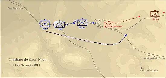 Dans la nuit du 13 au 14 mars, l'avant-garde de Wellington, formée de la division légère du général Erskine, de la 1re brigade portugaise indépendante de Pack et de la brigade de cavalerie de Arenschildt, reçut l'ordre pour le lendemain de maintenir le contact avec l'arrière-garde de Masséna. Cette dernière, composée de deux divisions du VIe corps, prit position à hauteur de Casal Novo, la division Marchand en première ligne soutenue trois à quatre kilomètres en arrière par la division Mermet[10].