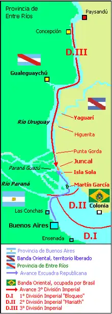 - la troisième division navale « impériale », sous les ordres du capitaine de frégate Jacinto Roque de Sena Pereira, avait pour mission de remonter le río Uruguay, pour diviser le front argentin en exploitant les désaccords politiques qui opposaient la province d’Entre Ríos et Buenos Aires, désaccords exacerbés par la ratification de la constitution de 1826. La troisième division devait également surveiller l’ensemble du río Uruguay, coupant les vivres à la force expéditionnaire argentine qui s’était aventurée en territoire brésilien, et favorisant une attaque éventuelle par le flanc pour aller occuper Entre Ríos.