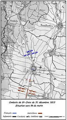 Ces derniers jours, de Wrede et Frimont n'avaient pu se procurer que des renseignements vagues et contradictoires sur la force réelle des troupes françaises qui leur étaient opposées, dans le Haut-Rhin en général et plus particulièrement celle postées dans le secteur de Colmar. Le 30, pour mettre fin à cette incertitude, ils prescrivirent au comte Hardegg (de) de pousser une forte reconnaissance sur Sainte-Croix[15].