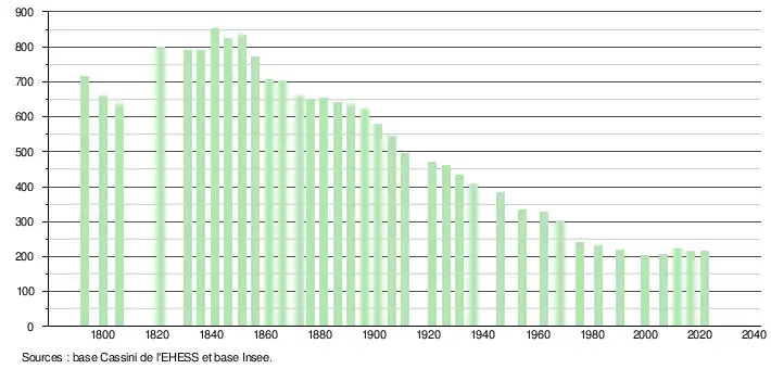 L'évolution du nombre d'habitants est connue à travers les recensements de la population effectués dans la commune depuis 1793. Pour les communes de moins de 10 000 habitants, une enquête de recensement portant sur toute la population est réalisée tous les cinq ans, les populations légales des années intermédiaires étant quant à elles estimées par interpolation ou extrapolation[24]. Pour la commune, le premier recensement exhaustif entrant dans le cadre du nouveau dispositif a été réalisé en 2006[25].