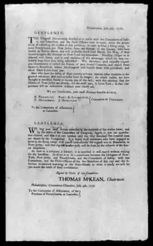 Avis, daté du 4 juillet 1776, d'un comité du Congrès aux miliciens de Lancaster, Pa. accompagné d'une lettre de recommandation du Comité de sécurité de Philadelphie, concernant