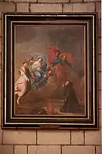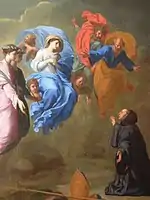 Eustache Le Sueur | Apparition de la Vierge, accompagnée de sainte Agnès, sainte Thècle, saint Pierre et saint Paul à saint Martin dit à tort Apparition de sainte Scholastique à saint Benoît[4] | 1654 | huile sur toile | 143 × 131 cm | Musée du Louvre |