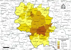 - Les densités de population sont calculées automatiquement dans un SIG en utilisant la surface géométrique de la commune, avec un niveau de précision du contour de 5 m tel qu'il ressort de l'export du découpage administratif au niveau communal (contours des communes) issu d'OpenStreetMap, et non la superficie cadastrale définie par l'Insee, qui est une donnée purement administrative. Des différences de classe peuvent ainsi éventuellement apparaître pour les communes qui se situent en limite de franchissement de seuil de classe.