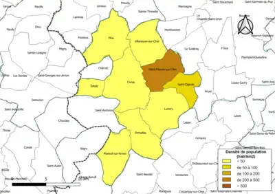 Carte des densités de population (millésimée 2016) des communes de la communauté de communes FerCher - Pays Florentais. Composition en communes au [3].