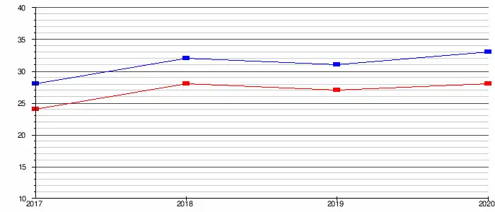 - la plus grande part des recettes est constituée des impôts locaux[Note 7] pour une valeur de 16 330 000 € (50 %), soit 362 € par habitant. Viennent ensuite des autres impôts[Note 8] pour 30 % et de la dotation globale de fonctionnement (DGF)[Note 9] pour 13 %.