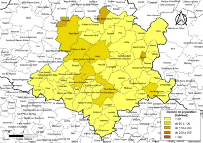 - Les densités de population sont calculées automatiquement dans un SIG en utilisant la surface géométrique de la commune, avec un niveau de précision du contour de 5 m tel qu'il ressort de l'export du découpage administratif au niveau communal (contours des communes) issu d'OpenStreetMap, et non la superficie cadastrale définie par l'Insee, qui est une donnée purement administrative. Des différences de classe peuvent ainsi éventuellement apparaître pour les communes qui se situent en limite de franchissement de seuil de classe.