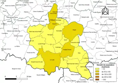 Carte des densités de population (millésimée 2016) des communes de la communauté de communes Sud Sarthe. Composition en communes au [4].