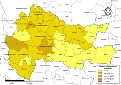 Carte des densités de population (millésimée 2016) des communes de la communauté de communes Terres de Chalosse. Composition en communes au [3].