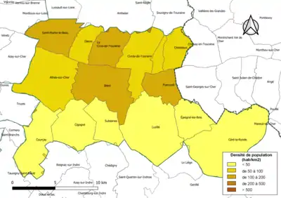 Carte des densités de population (millésimée 2016) des communes de la communauté de communes Autour de Chenonceaux Bléré-Val de Cher. Composition en communes au [2].