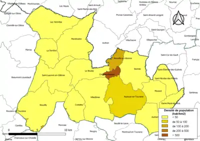 Carte des densités de population (millésimée 2016) des communes de la communauté de communes du Castelrenaudais. Composition en communes au [2].