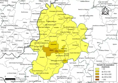 - Les densités de population sont calculées automatiquement dans un SIG en utilisant la surface géométrique de la commune, avec un niveau de précision du contour de 5 m tel qu'il ressort de l'export du découpage administratif au niveau communal (contours des communes) issu d'OpenStreetMap, et non la superficie cadastrale définie par l'Insee, qui est une donnée purement administrative. Des différences de classe peuvent ainsi éventuellement apparaître pour les communes qui se situent en limite de franchissement de seuil de classe.