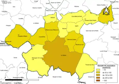 Carte des densités de population (millésimée 2016) des communes de la communauté de communes du Pays Fléchois. Composition en communes au [4].