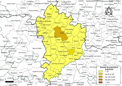Carte des densités de population (millésimée 2016) des communes de la communauté de communes du Pays loudunais. Composition en communes au [2].