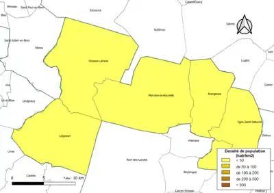 Carte des densités de population (millésimée 2016) des communes de la communauté de communes du Pays Morcenais. Composition en communes au [2].