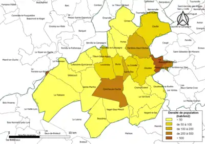 - Les densités de population sont calculées automatiquement dans un SIG en utilisant la surface géométrique de la commune, avec un niveau de précision du contour de 5 m tel qu'il ressort de l'export du découpage administratif au niveau communal (contours des communes) issu d'OpenStreetMap, et non la superficie cadastrale définie par l'Insee, qui est une donnée purement administrative. Des différences de classe peuvent ainsi éventuellement apparaître pour les communes qui se situent en limite de franchissement de seuil de classe.