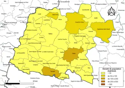 Carte des densités de population (millésimée 2016) des communes de la communauté de communes du Pays de Craon. Composition en communes au [3].