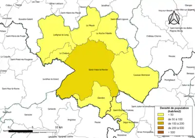 Carte des densités de population (millésimée 2016) des communes de la communauté de communes du Pays de Saint-Yrieix. Composition en communes au [3].