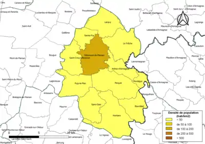 Carte des densités de population (millésimée 2016) des communes de la communauté de communes du Pays de Villeneuve en Armagnac Landais. Composition en communes au [2].