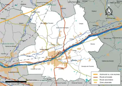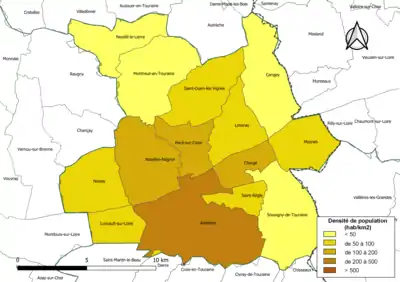 Carte des densités de population (millésimée 2016) des communes de la communauté de communes du Val d'Amboise. Composition en communes au [2].